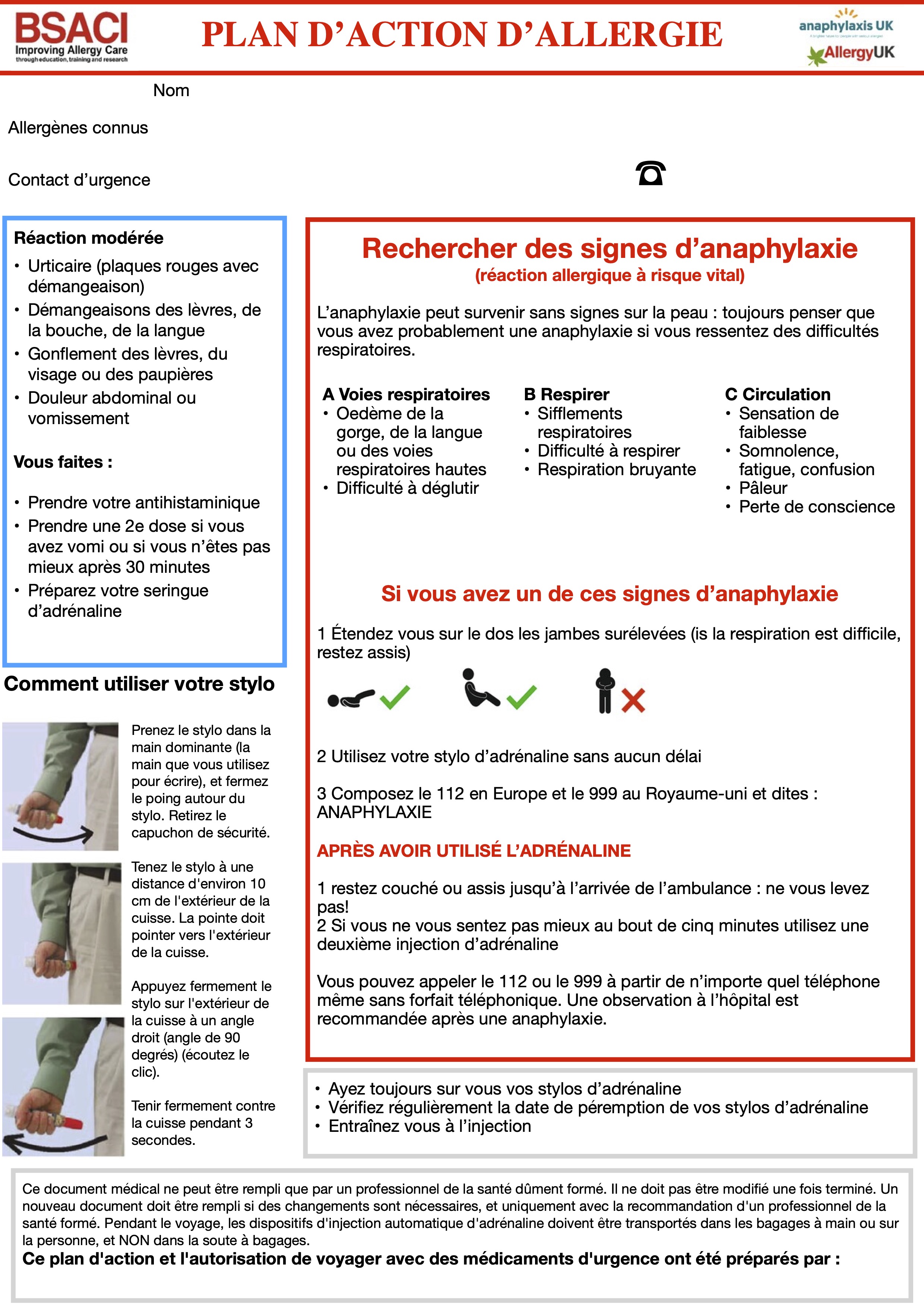 Le BSACI a créé un PAA pour adultes en libre accès en collaboration avec les organismes de bienfaisance nationaux pour les patients allergiques, Allergy UK et Anaphylaxis UK, sous la supervision du BSACI Standards of Care Committee (SOCC).