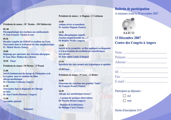 C’est le 13 décembre 2007, au centre des congrès d’Angers que la SAICO nous propose de traiter le sujet des allergies aux anesthésiques. Le sujet devait certainement être dans l’air car il sera également abordé par l’APALA (à Bordeaux) deux semaines avant.