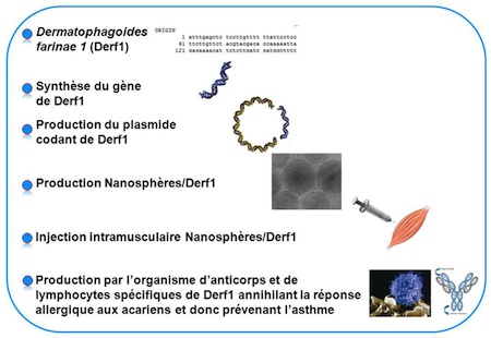 Le vaccin mis au point dans un modèle de souris saines a ensuite été optimisé dans un modèle de souris asthmatiques. Chez ces dernières il déclenche une fabrication d’anticorps spécifiques anti Derf1 et une réponse cellulaire spécifique de Derf1, orientant ainsi le système immunitaire vers une réponse non allergisante, protectrice lorsque l’allergène est rencontré. Les deux injections nécessaires et administrées à 3 semaines d’intervalle ont réduit de manière significative l’hypersensibilité des voies aériennes et les niveaux de cytokines inflammatoires qui étaient en revanche présentes dans les poumons de souris asthmatiques non vaccinées.