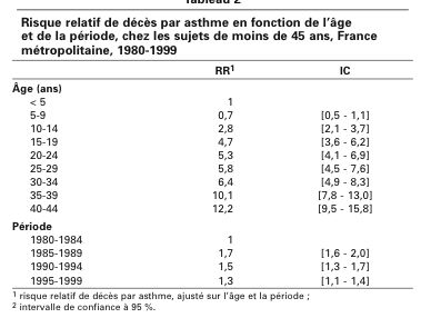 D’ailleurs l’observation du risque relatif de décés par asthme selon les années montre très bien (cf tableau) que pour un risque de 1 en 1980 nous sommes actuellement à un risque de 1,3.